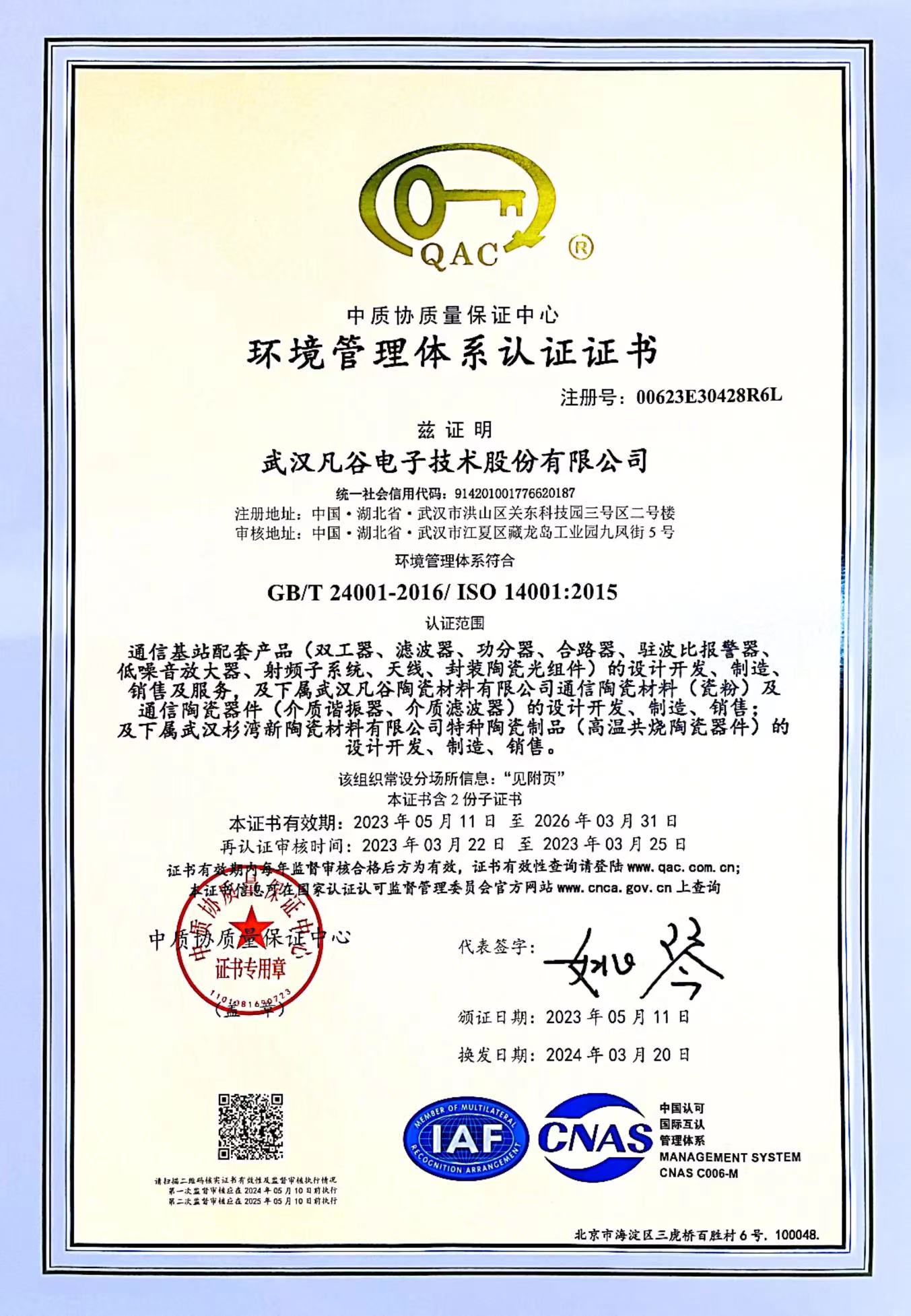 公司自2004年通過ISO14001環(huán)境管理體系認證,目前保持有ISO14001:2015管理體系認證證書。